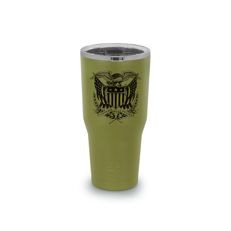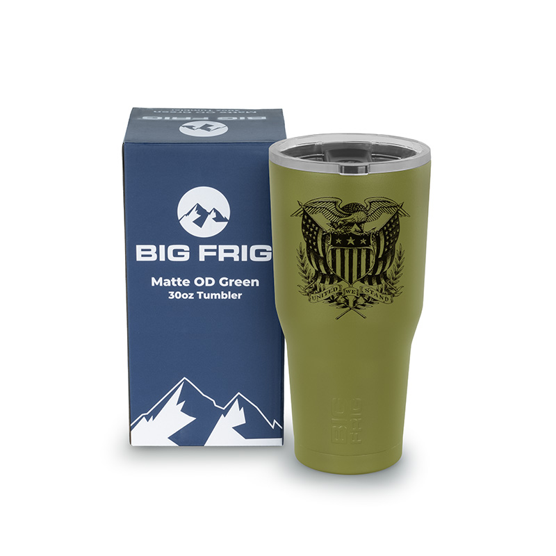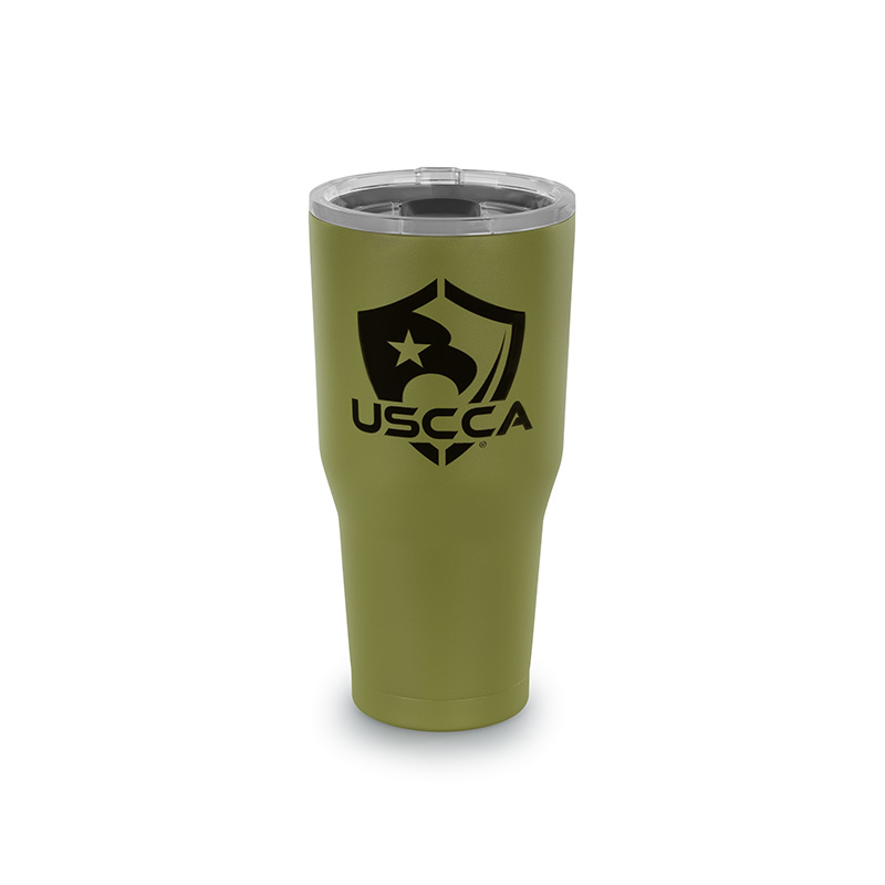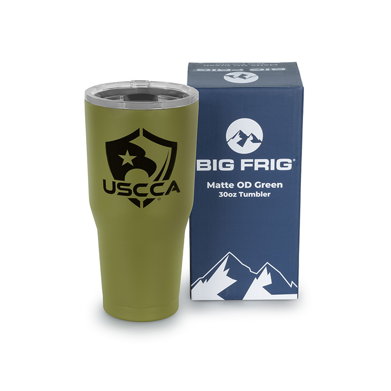This 30oz Big Frig tumbler is the perfect blend of capacity, patriotism, and durability. Featuring double-walled vacuum insulation and cold-worked stainless steel for durability. Its wide-mouth design features a tapered bottom to fit most standard cup holders, while the sliding lid closure means your beverage stays covered, and secure. On the front the American flag can be found laser-engraved with the USCCA logo on its bottom right corner. Use this high-capacity mug to keep you hydrated on the go, at the office, or on the range.