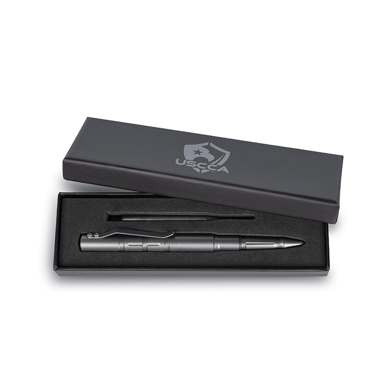 This Tactical Pen features the USCCA Logo graphic, giving a nod to those in the know, that you’re prepared if a situation arises. When not in use, store the pen in a sturdy USCCA-branded package that will stand out on any desk or office table.